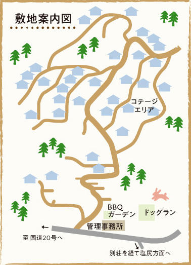 コテージ全35棟 信州の大自然を背景に、皆様でお楽しみいただけます。各棟がそれぞれ離れており、プライバシーを確保出来ます。